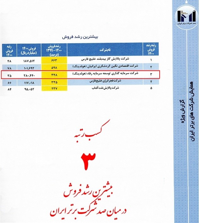 کسب رتبه سوم در بیشترین رشد فروش در میان صد شرکت برتر ایران